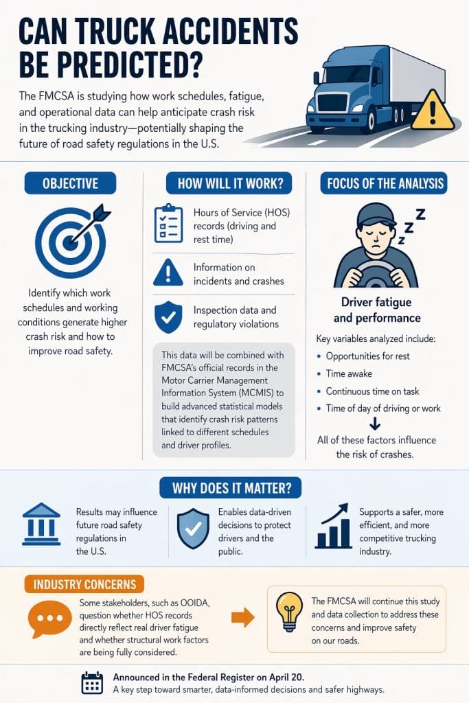 The Federal Motor Carrier Safety Administration is advancing a major study to analyze how driver schedules, fatigue, and operational data can help predict crash risk in the trucking industry—potentially shaping future safety regulations in the United States.