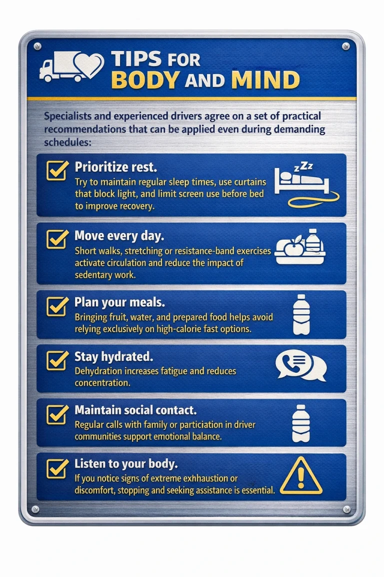 Social media and driver communities are full of recommendations on how to organize movement routines in small spaces, prepare balanced meals, or improve sleep quality inside the cab.