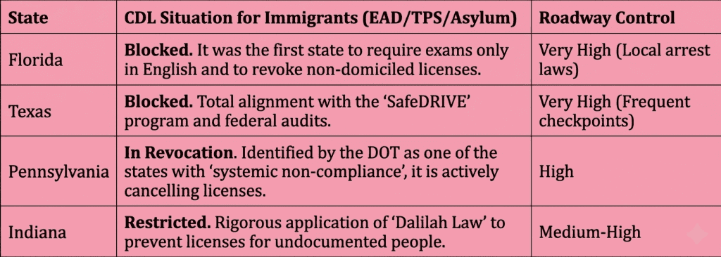 - Illinois and New York: They maintain policies that have historically supported immigrants but are under threat of losing federal transportation funds if they don’t revoke CDLs from those without the specific visas mentioned above. They remain more “friendly” states for administrative processes, but roadside surveillance has increased.