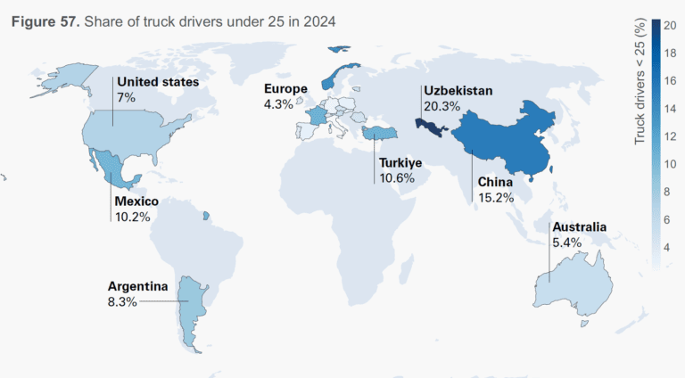 Este envejecimiento de la fuerza laboral es especialmente preocupante, ya que en los próximos cinco años se estima que 3.4 millones de conductores en los países analizados se jubilarán. En Australia, se espera que el 21 % de los conductores actuales se retiren para 2029; en China, el 18 %; y en Europa, el 17 %. Esto implica que la escasez de mano de obra podría intensificarse aún más, ampliando el abismo generacional existente.