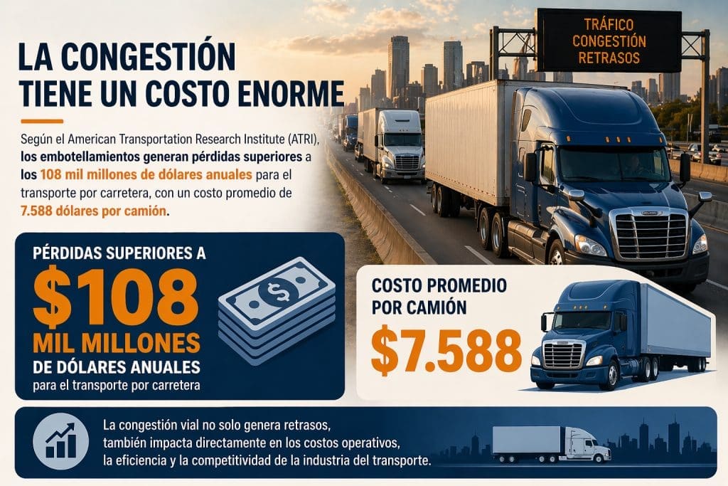 Según datos del American Transportation Research Institute (ATRI), los embotellamientos generan pérdidas superiores a los 108 mil millones de dólares anuales para el transporte por carretera, con un costo promedio de 7.588 dólares por camión.